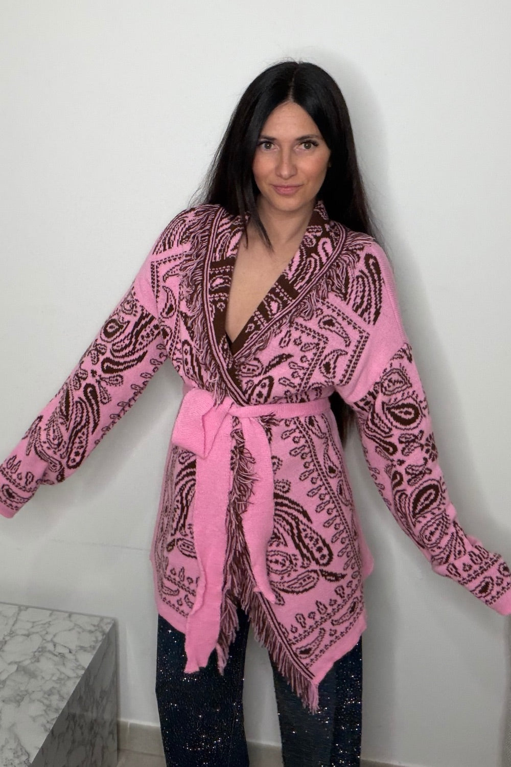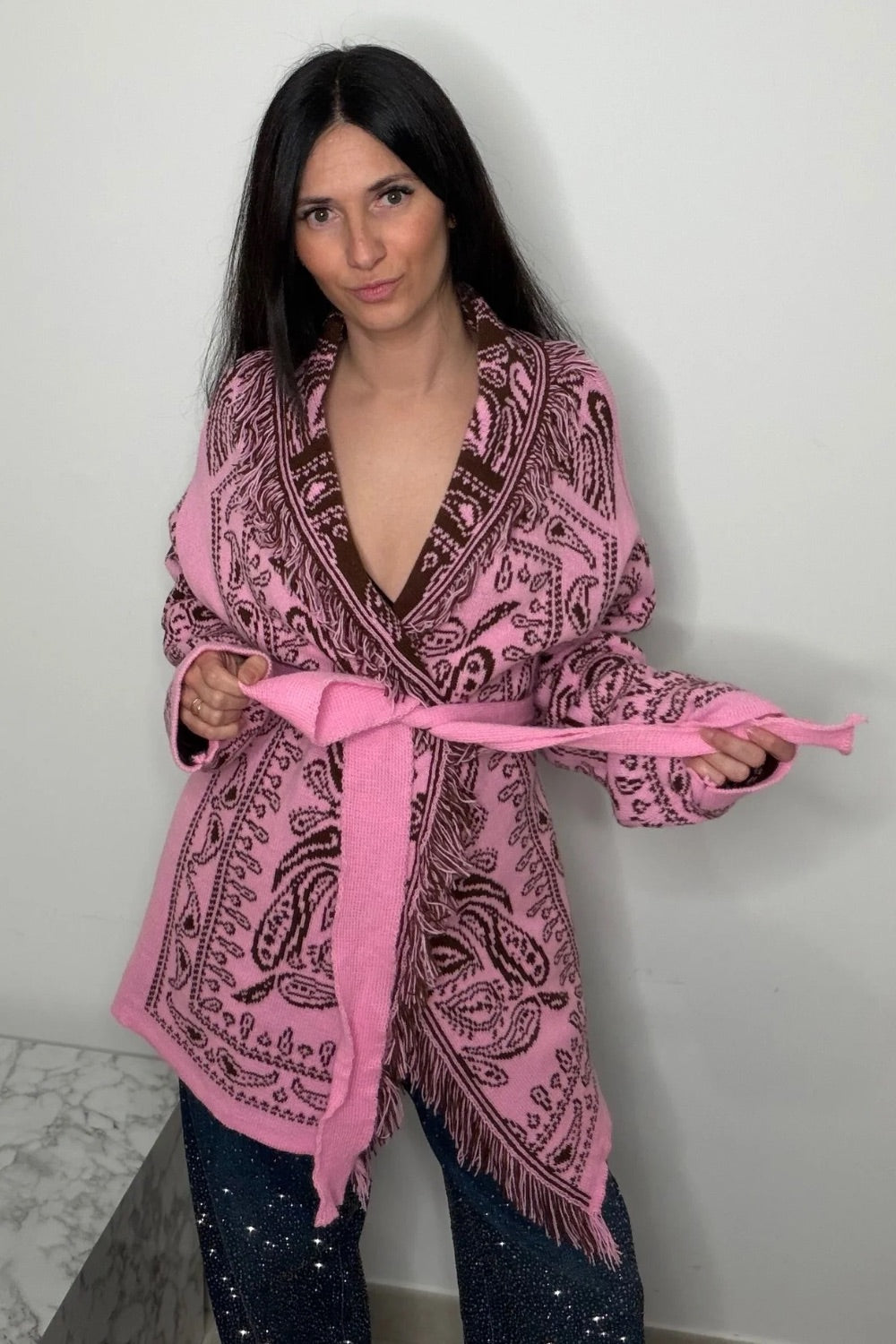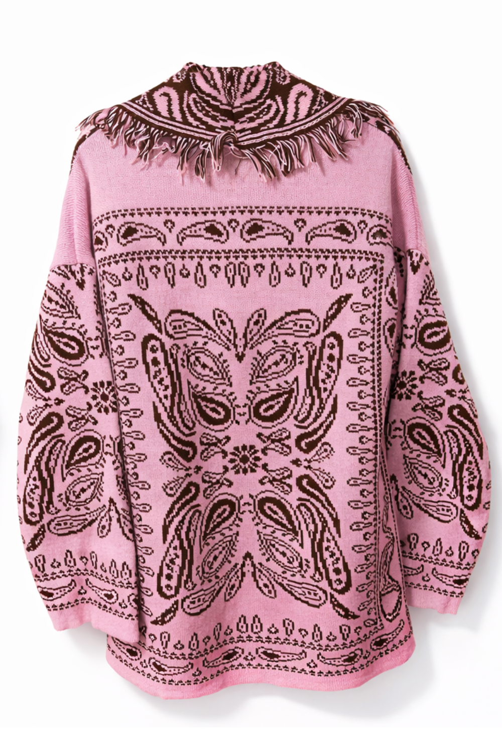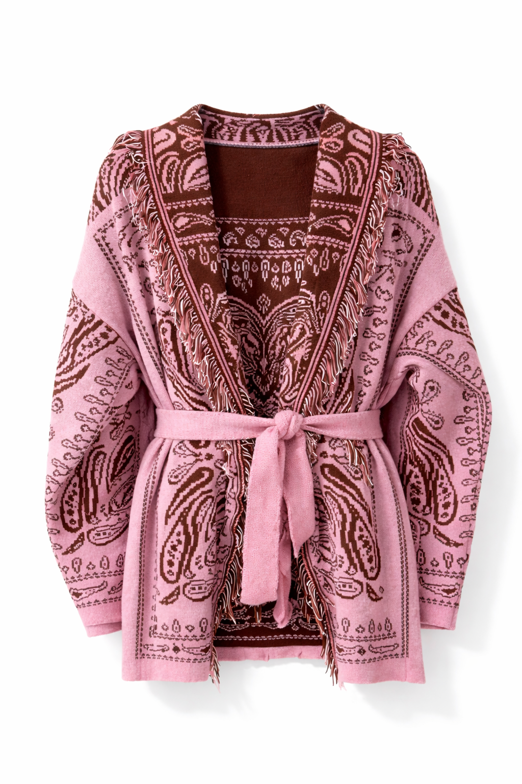 Veste avec motifs marron style bandana. Coupe droite à manches longues. Col large avec franges et ceinture.