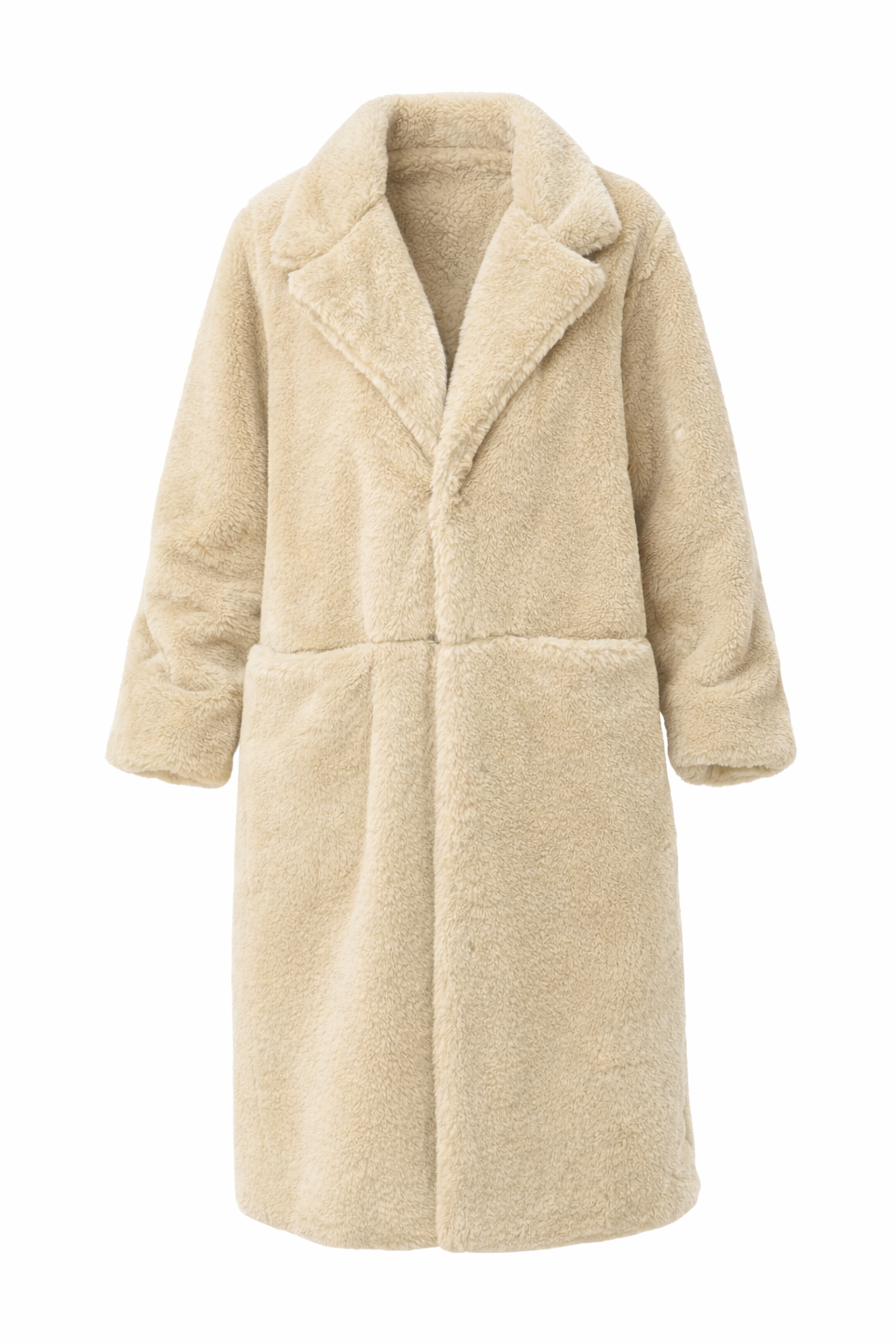 Manteau long en fausse fourrure avec col à revers et manches longues. Poches avant. fermeture portefeuille à boutons sur le devant. Forme oversize.