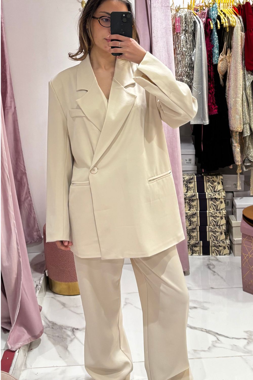 Ensemble veste blazer avec fermeture croisée et pantalon très confortable avec taille élastique. Taille unique convient d’un 34 à un 44.